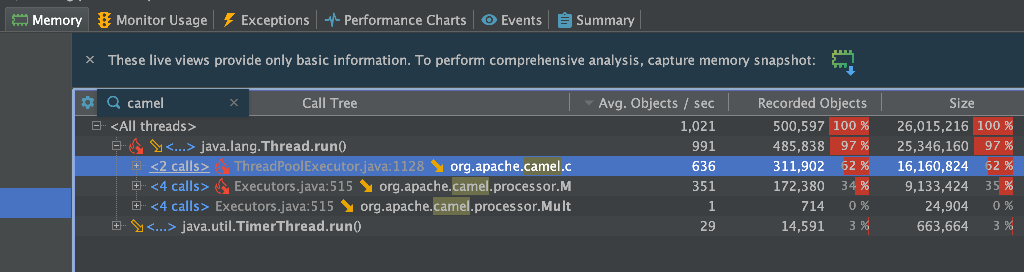 Another related problem is that in Camel 3 due to the modularization then some of the languages (bean, simple, and others) have been changed from being a singleton to prototype scoped. This is one of the biggest problems and we had a Camel user report a problem with thread contention in a high concurrent use-case would race for resolving languages (they are prototype scoped). So you would have this problem, and because the language resolver would query the registry first then Spring would throw NoSuchBeanDefinitionException, and then Camel would resolve the language via its own classpath resolver. So all together this cost performance. We can see this in the screenshots from the profiler in the following.